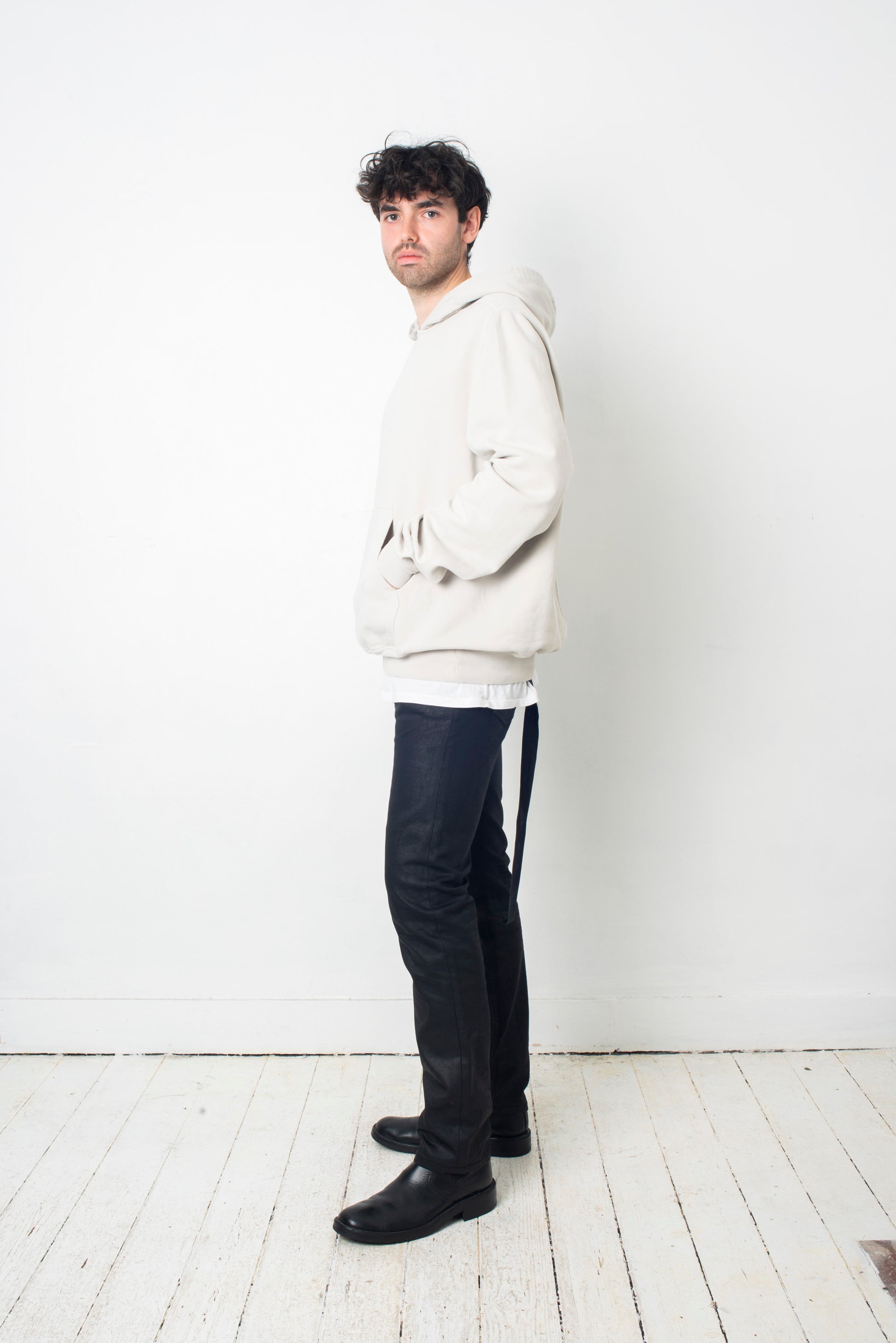 here worn with a Margiela bleached denim coat, also available online