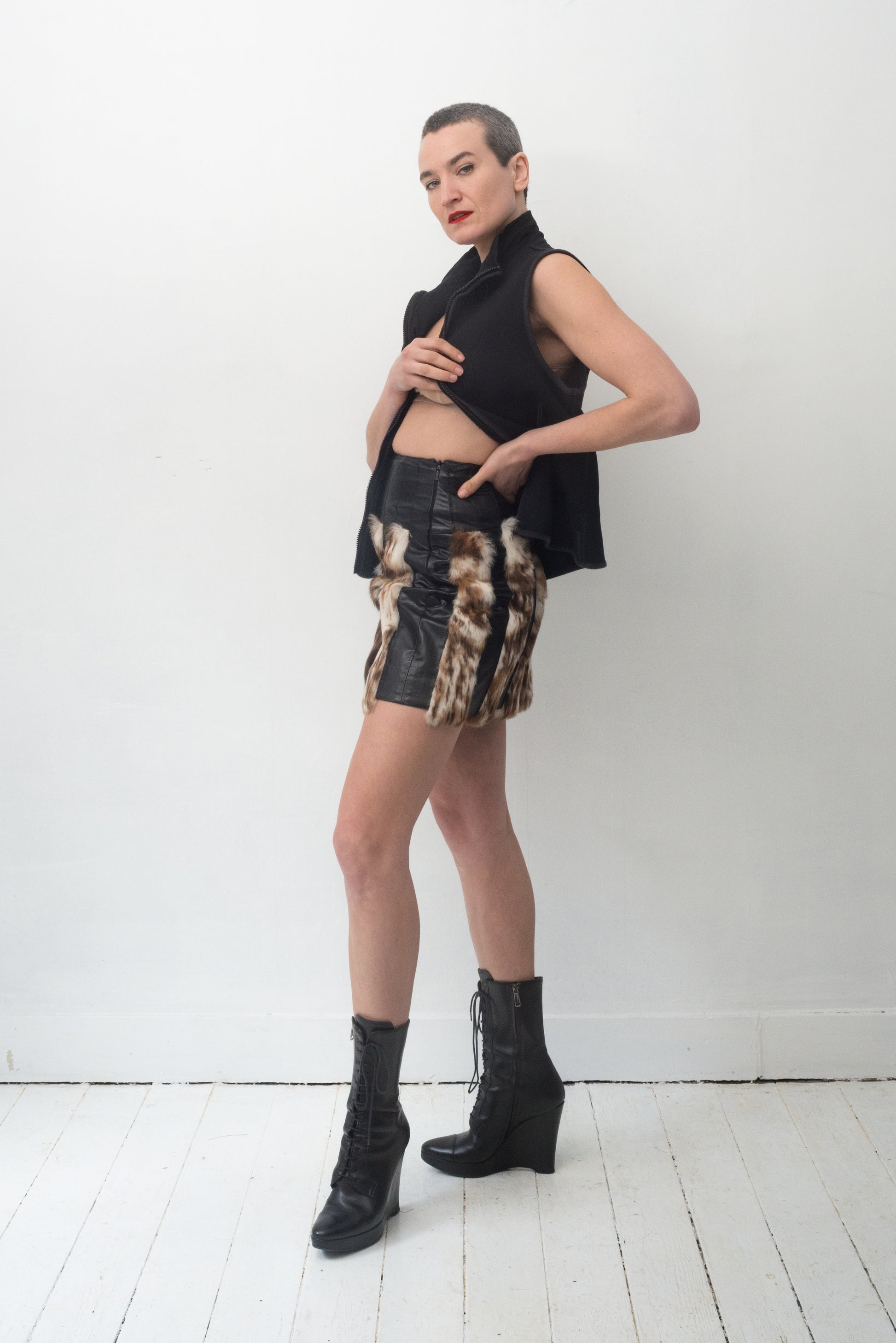 Quintessentially 90's, this sexy and playful leather and fur miniskirt by Versace, from the Versus line.