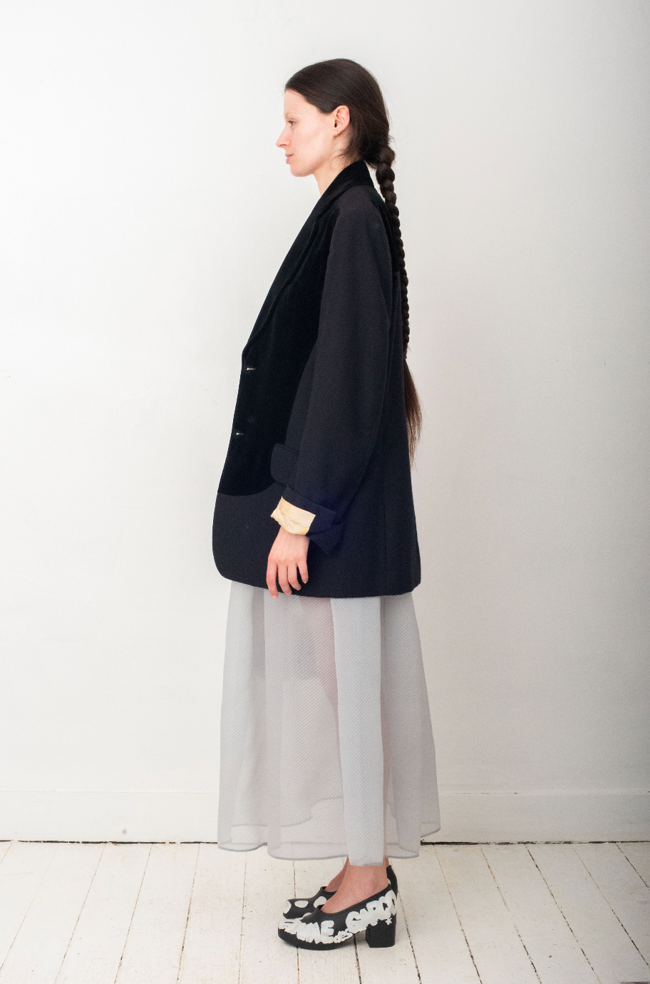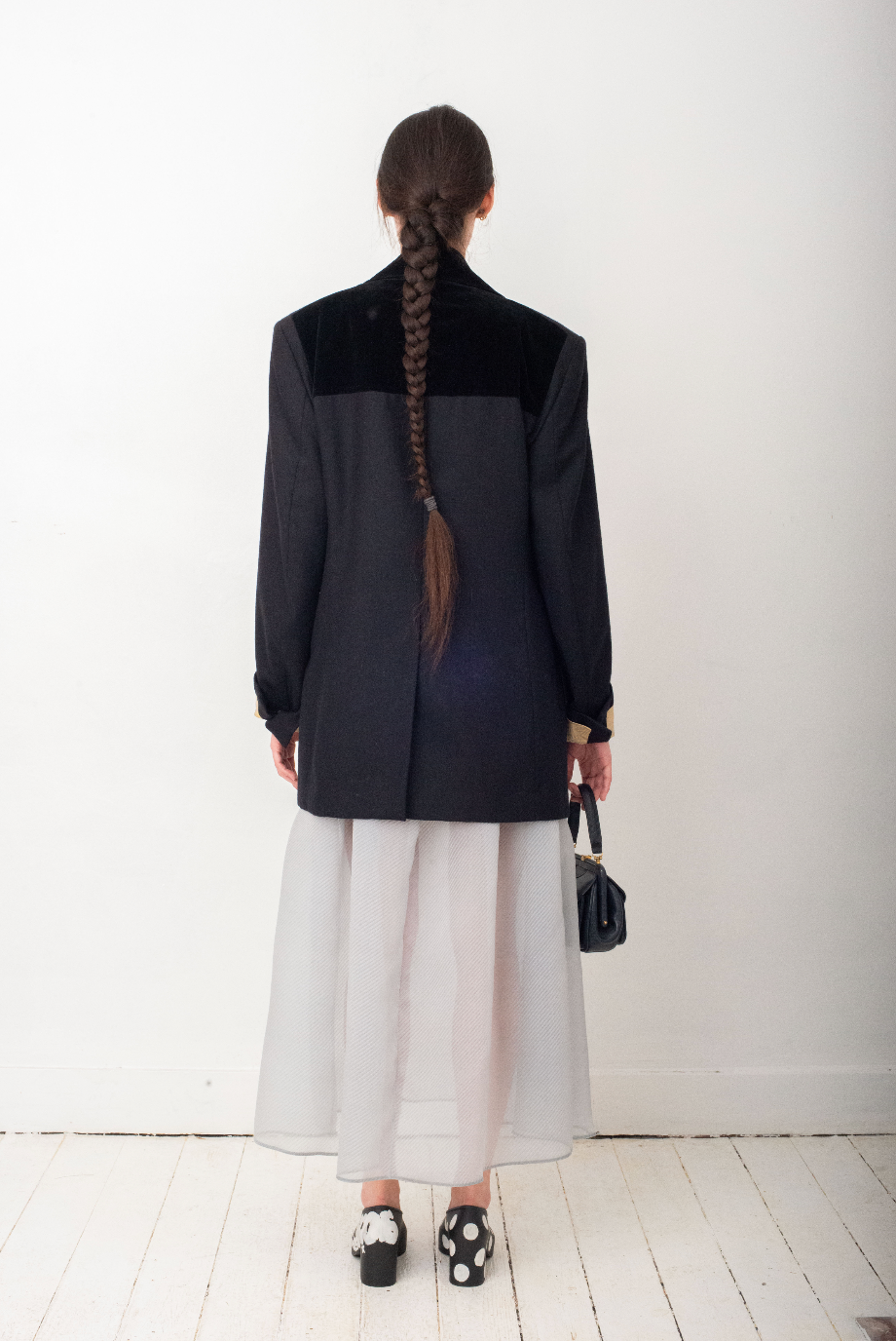 single breasted, with two front pockets and a two button closure, the jacket is made from a thick black wool, while a velvet panel is covering the front, the collar and the upper back of the jacket.
