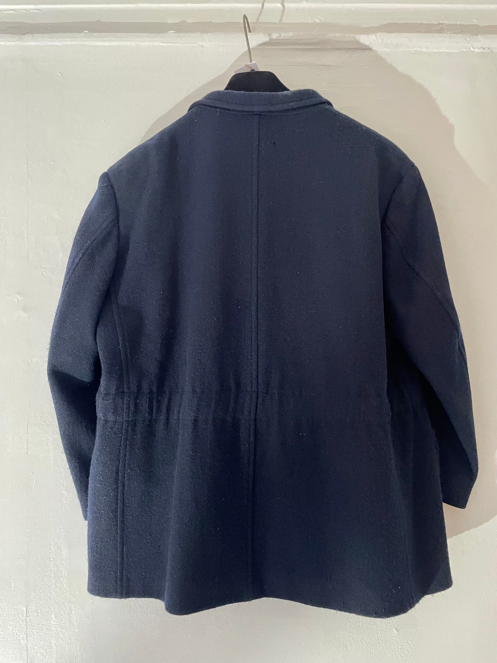 Her basic and straight forward design is countered with a particular detail at the waist level: a belt, from the same fabric, is inserted in the jacket, it goes through the lining in the back only to pop out in the front where it is attached on both sides with two buttons.