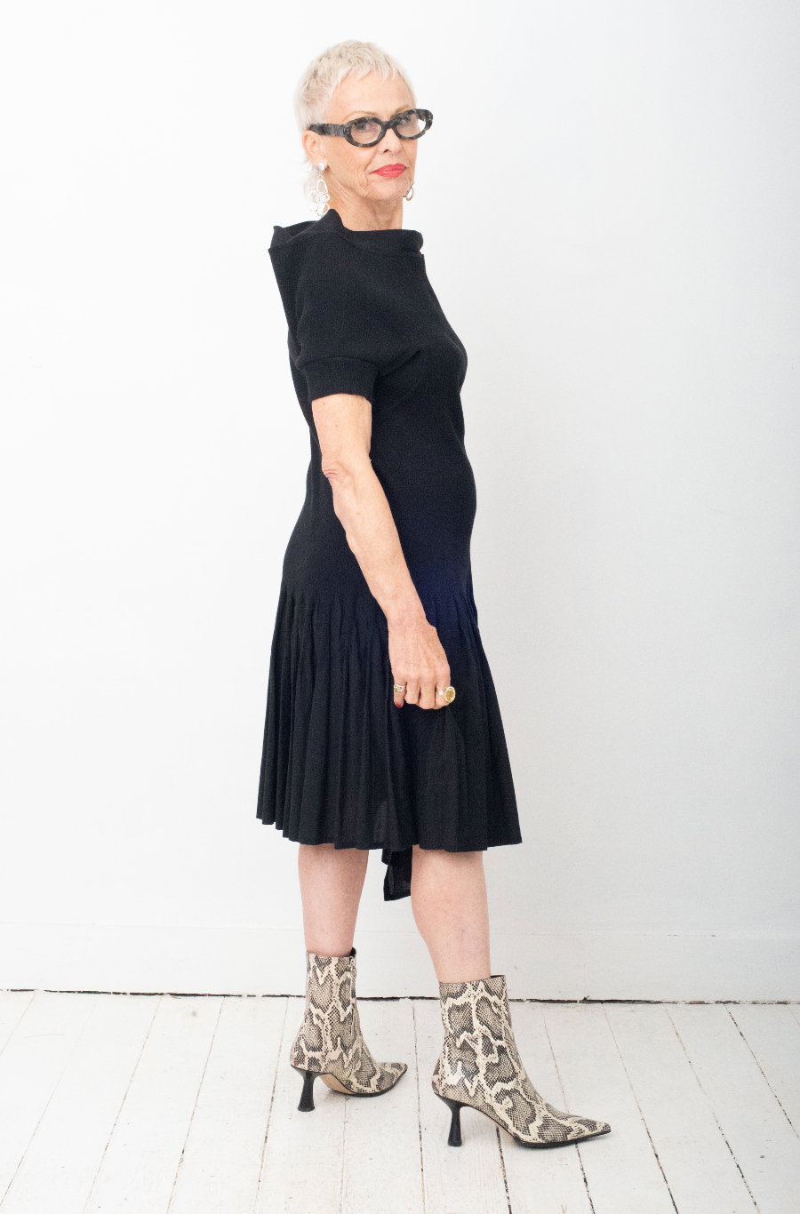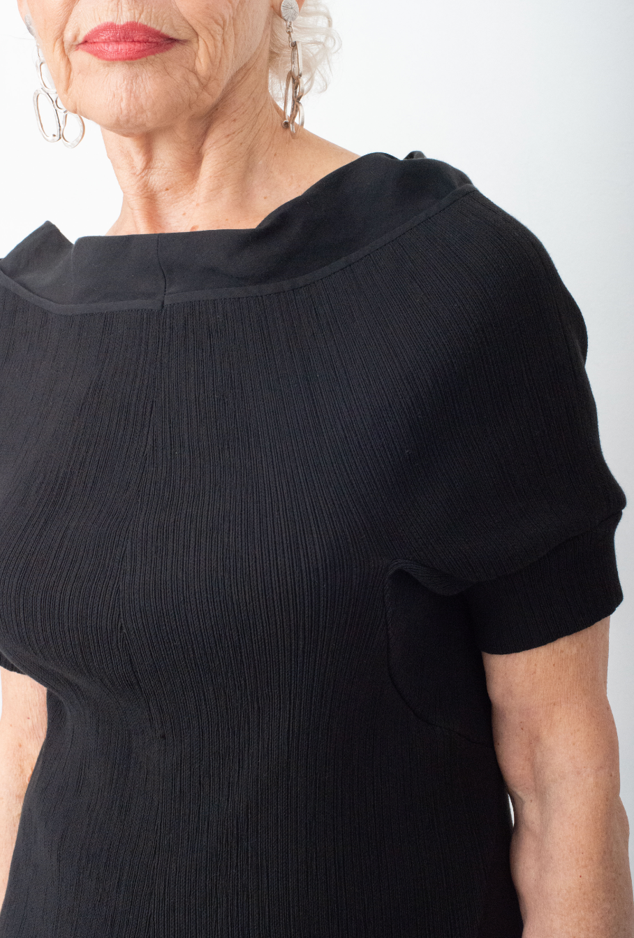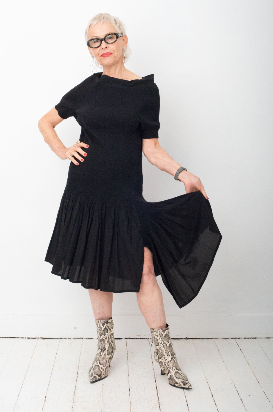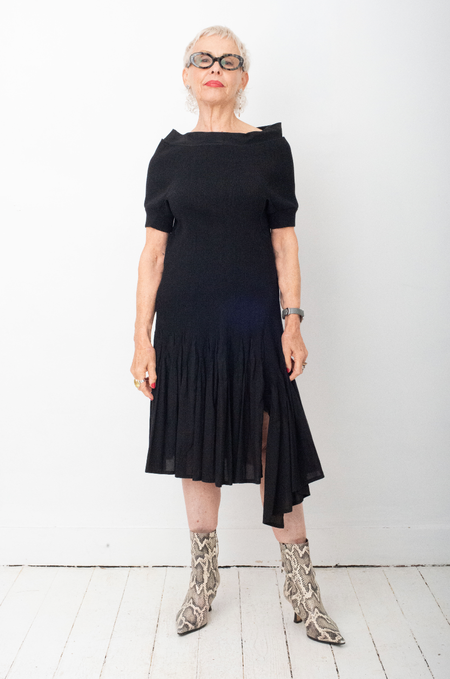 Very interesting black ribbed dress by Yohji Yamamoto, Japanese fashion genius inspired by the culture of his ancestors, politics and human mind.