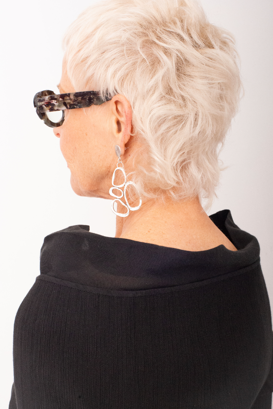 The low hanging sleeves and the wide, erect collar enhance the shoulders really nicely, as well as the silhouette of the dress compliments the body. The lower part of the skirt fades from the black stretchy ribbed knit into a light black cotton fabric that creates an effect of pleats. It also has an asymmetrical slit on the side that is a little longer than the other.