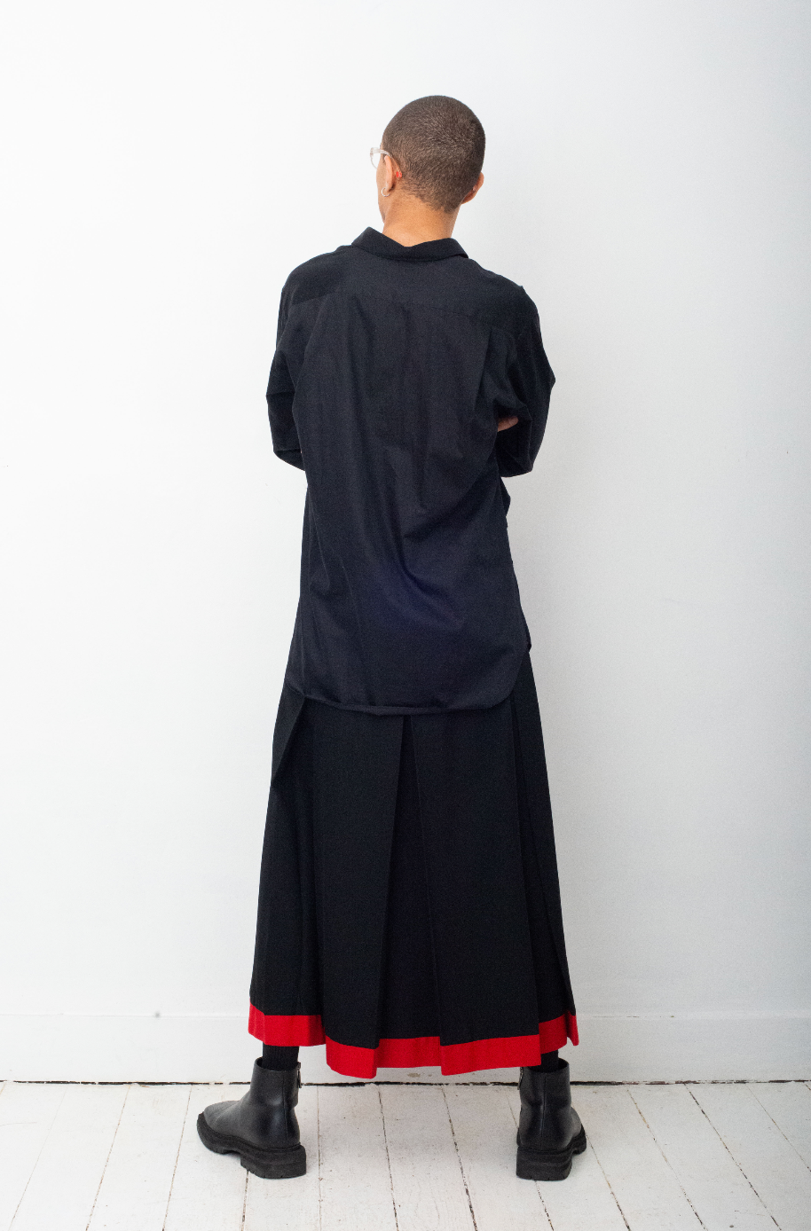 Yohji Yamamoto black pleated long high waisted skirt, with a bright red line covering the bottom hem.