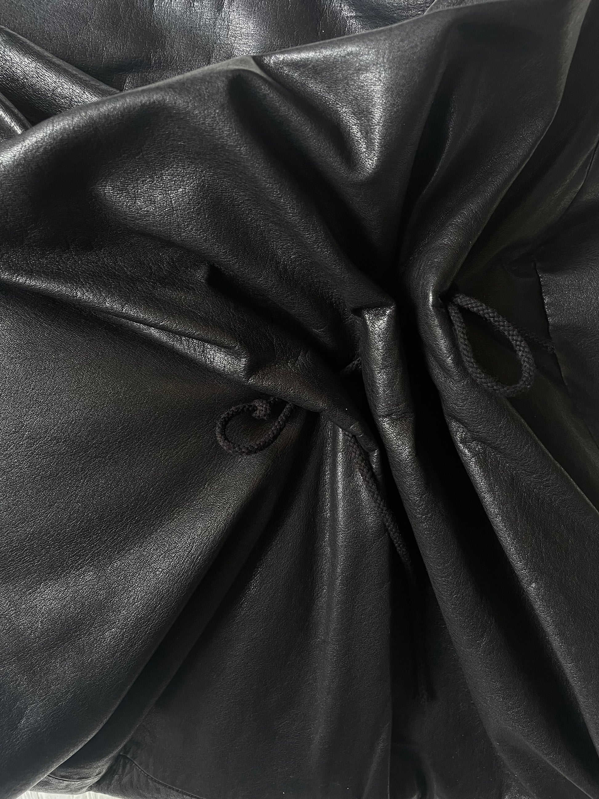 This shoulder bag is made of very soft leather, and its appearance can be changed by tightening the cord on the front, creating an asymmetric shape. It has a voluminous, padded appearance.