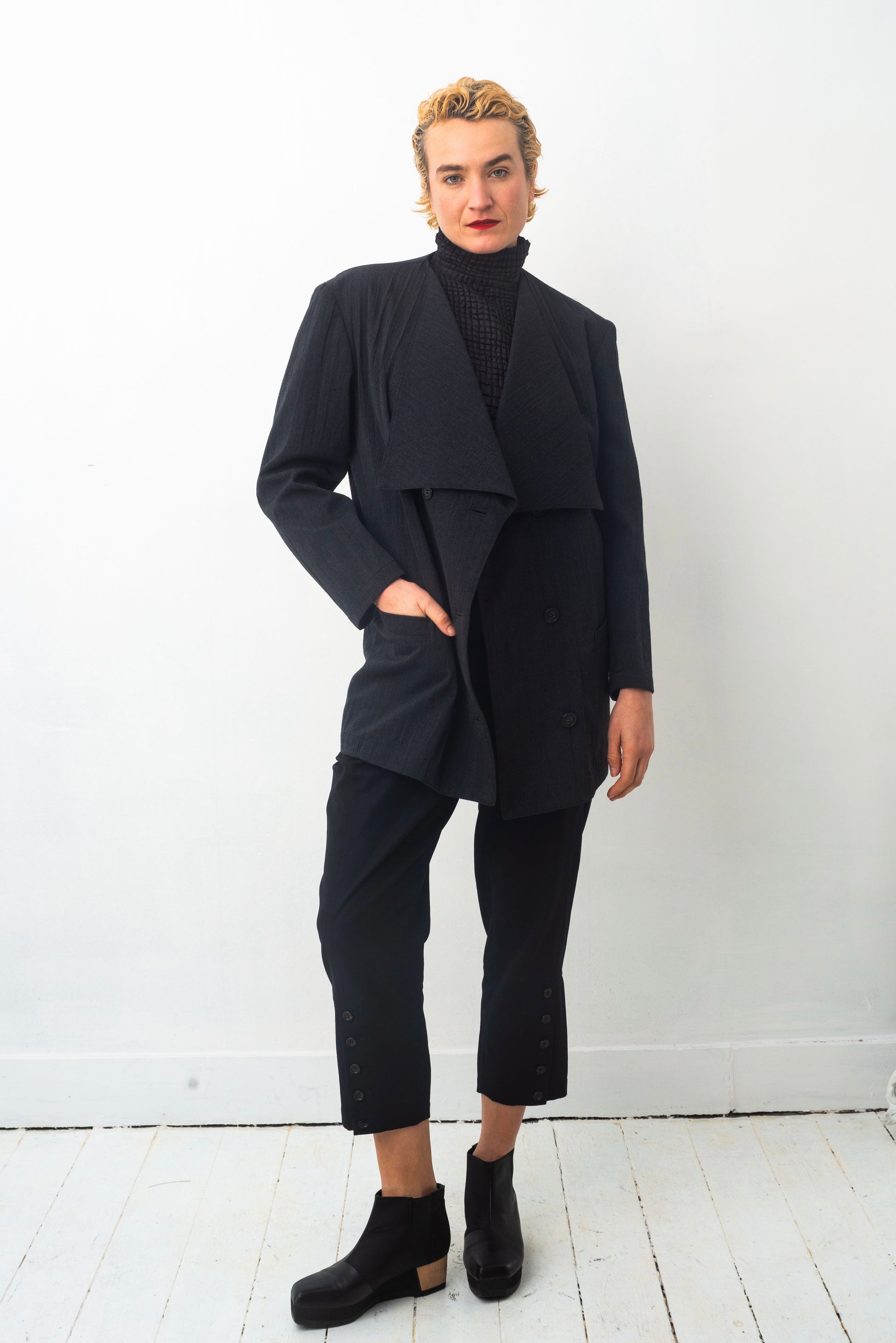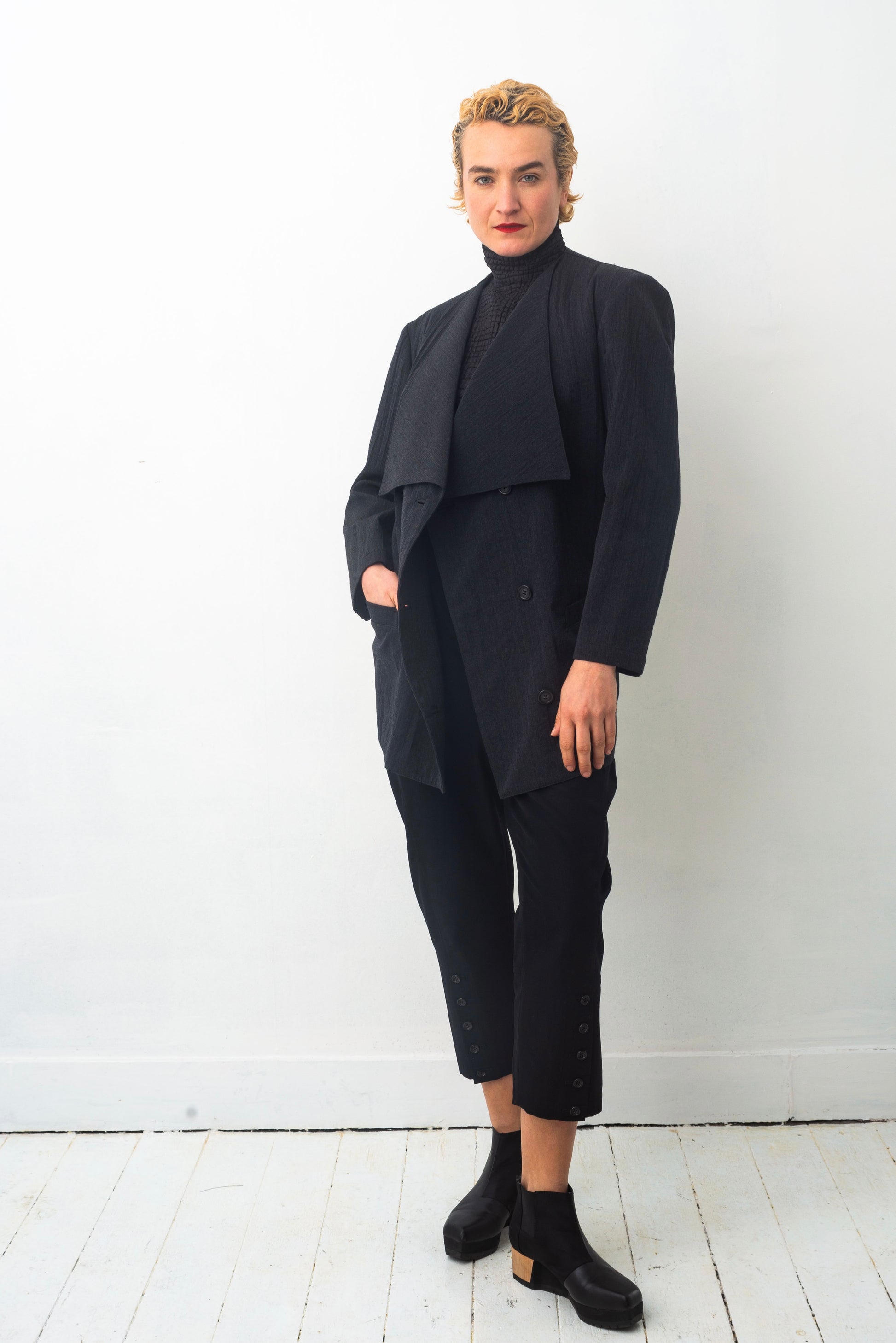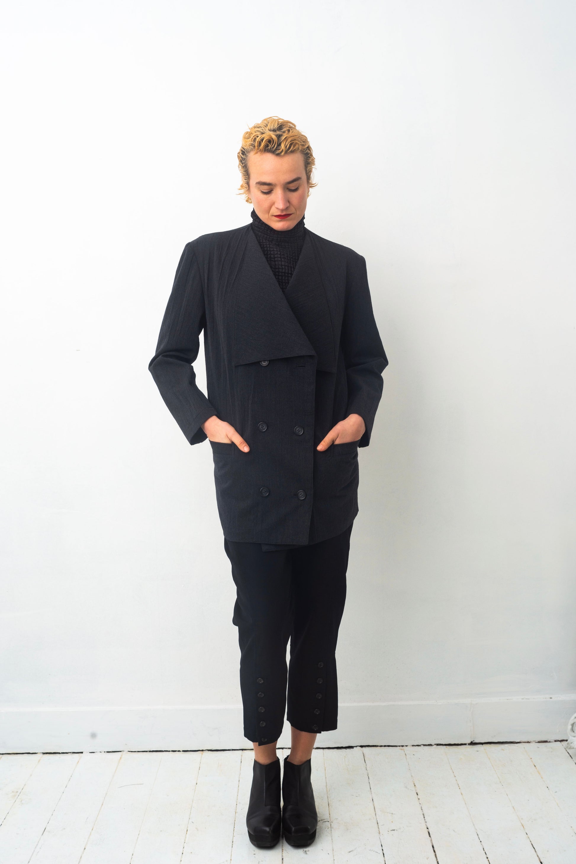 Double breasted, this jacket is as beautiful closed as it is left open.
