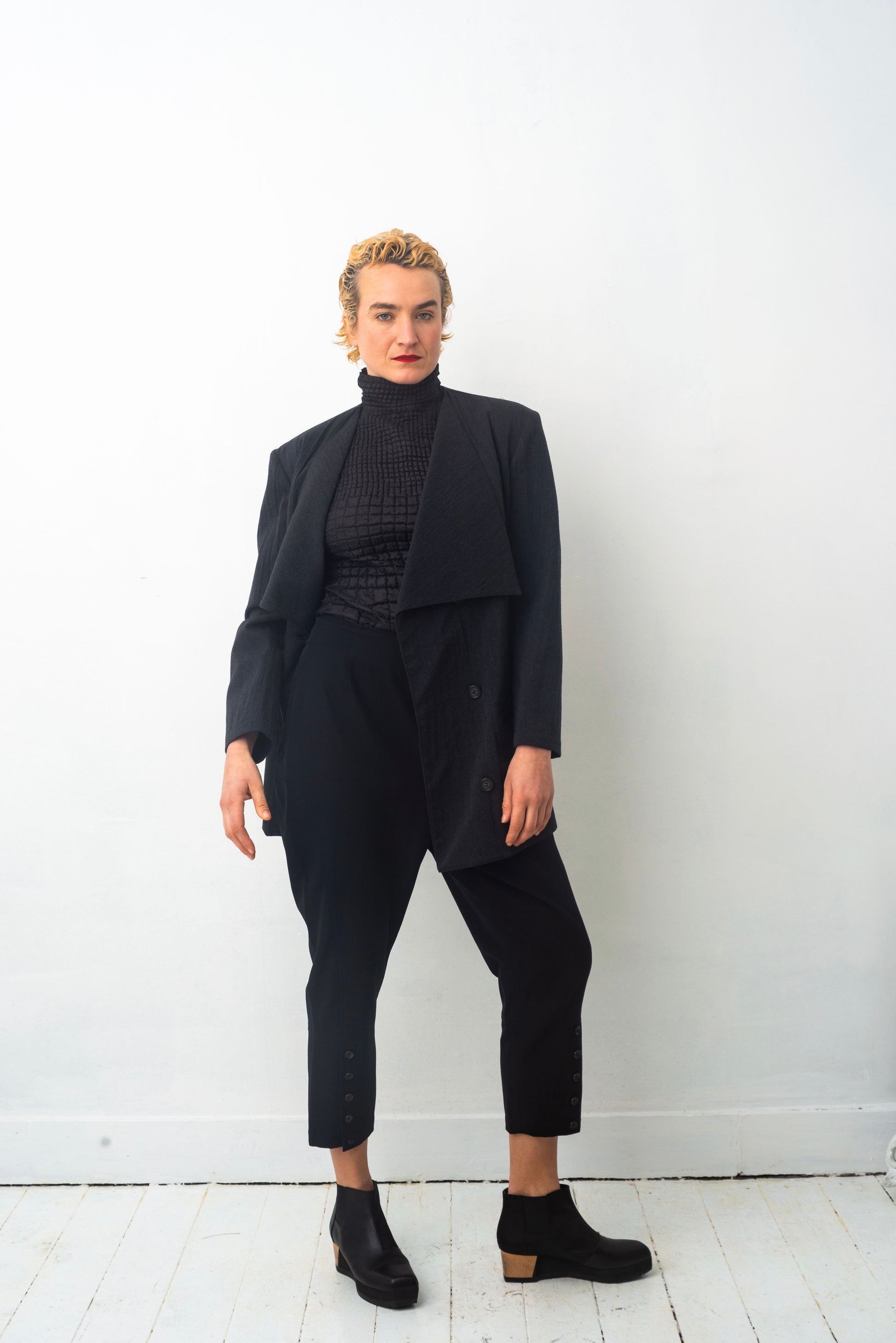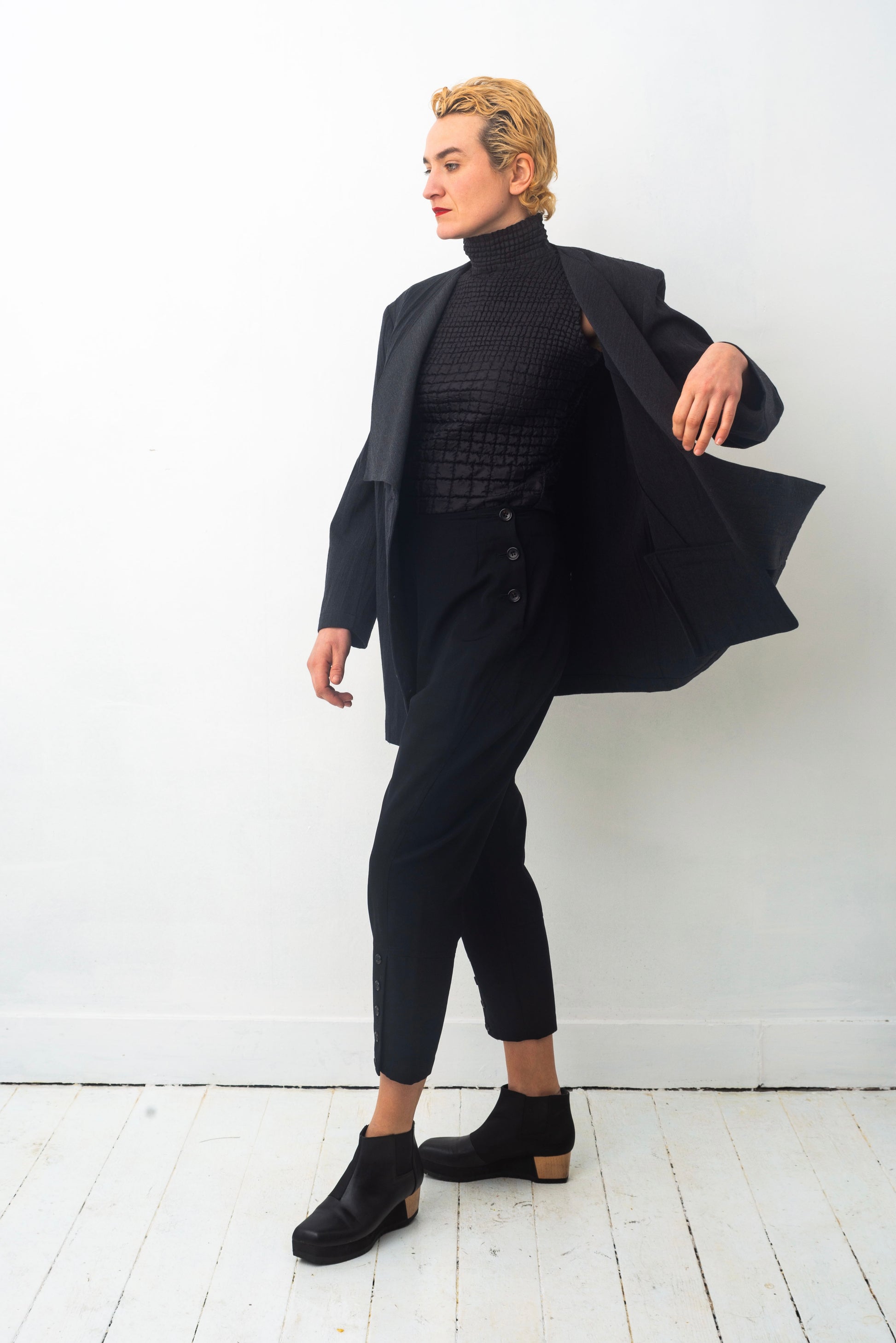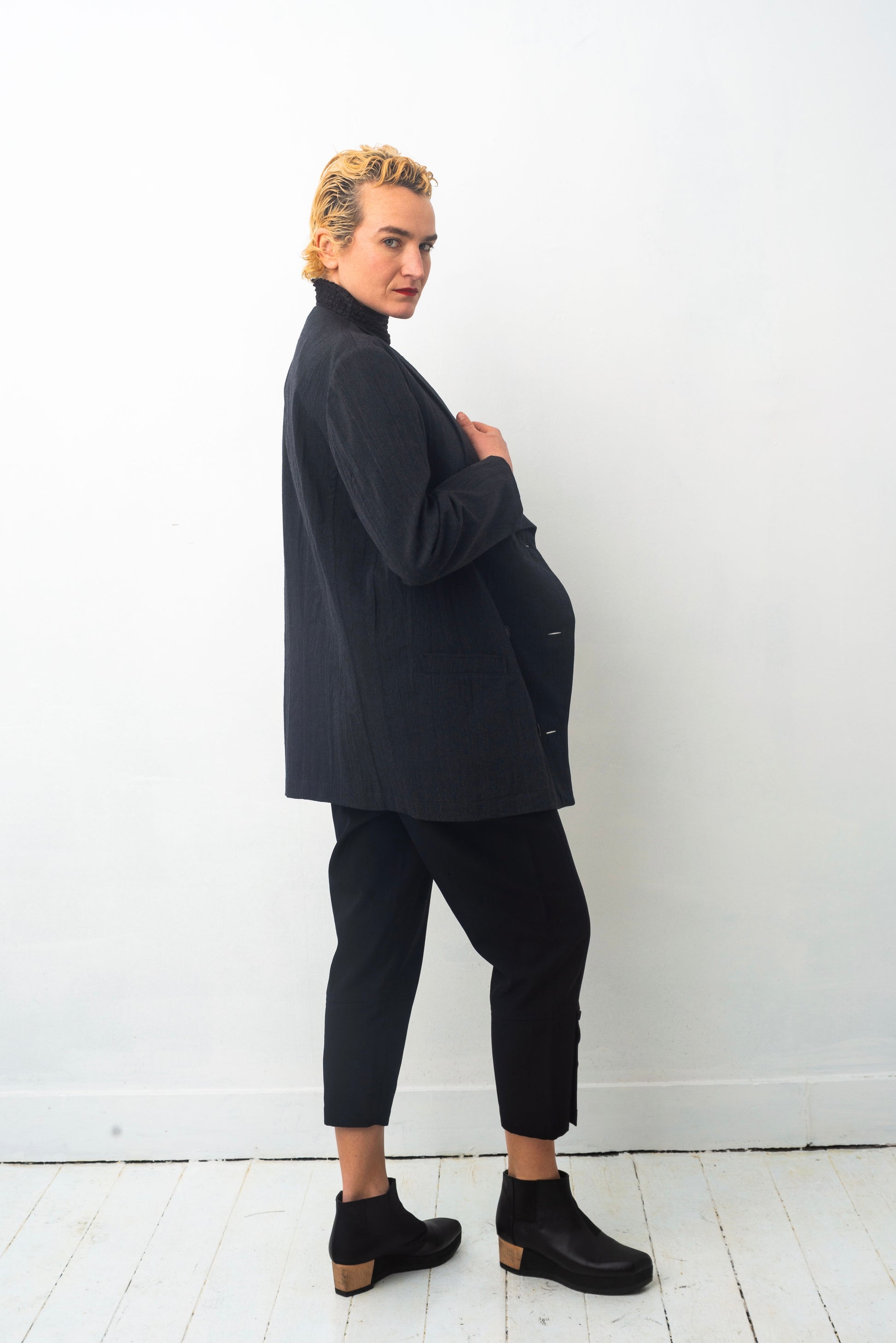 Double breasted, this jacket is as beautiful closed as it is left open.
