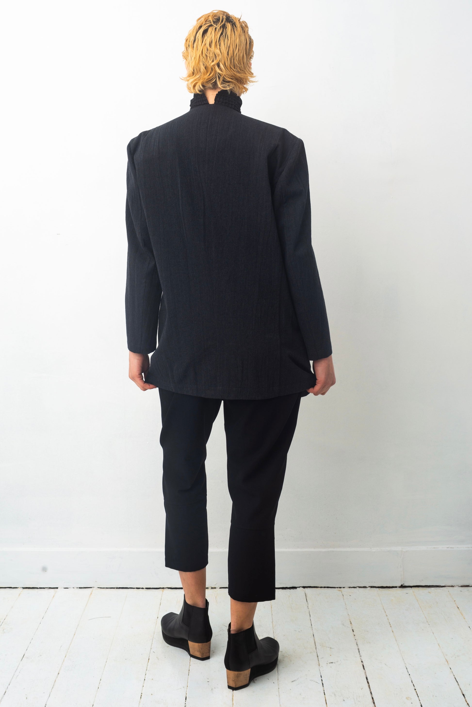 Sculptural Y's blazer from the 90's in a sturdy grey wool with a wrinkled effect and an large, sharp triangular collar.