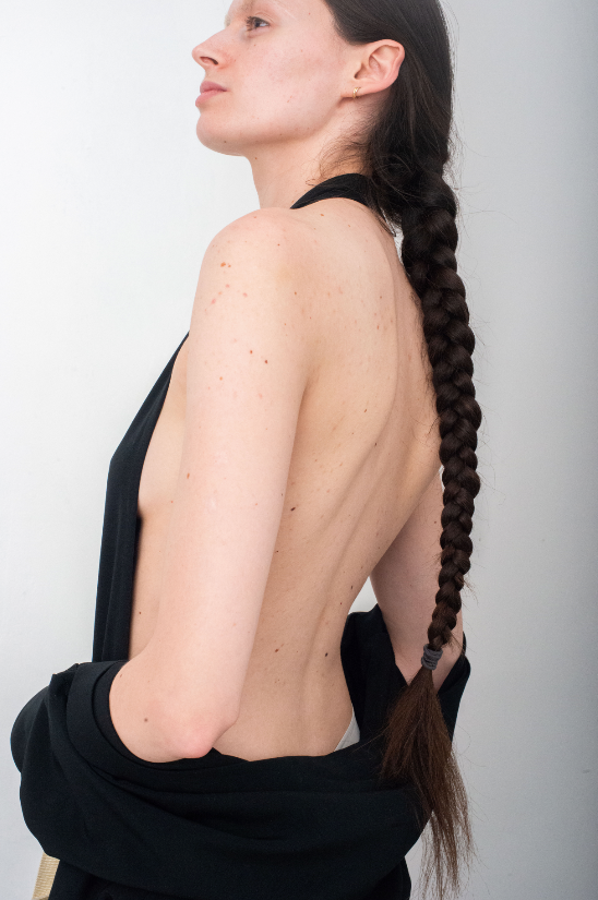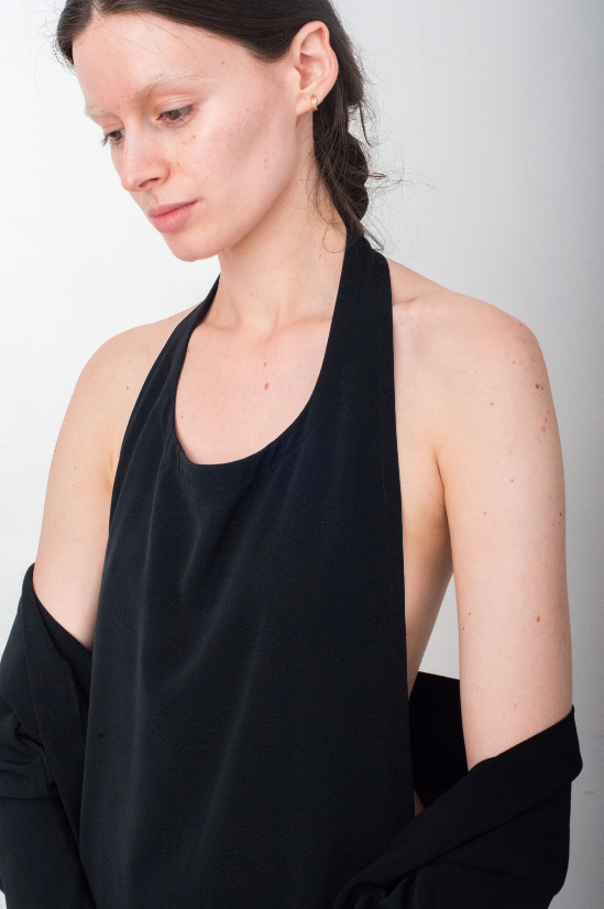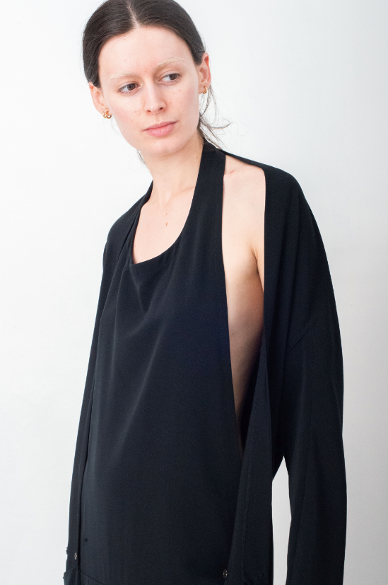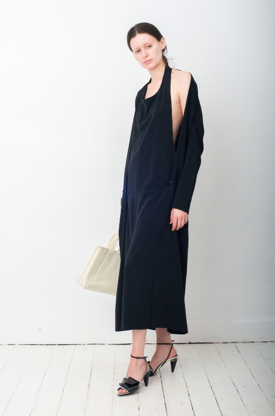 The construction of the dress is very unique, it can be worn in different ways. The top part of the dress is shaped like an apron, exposing a beautiful open back silhouette. A long sleeved jacket is attached to the back of the dress, it can be worn either over the shoulder or by tying the sleeves around the waist, for a more laid back look.
