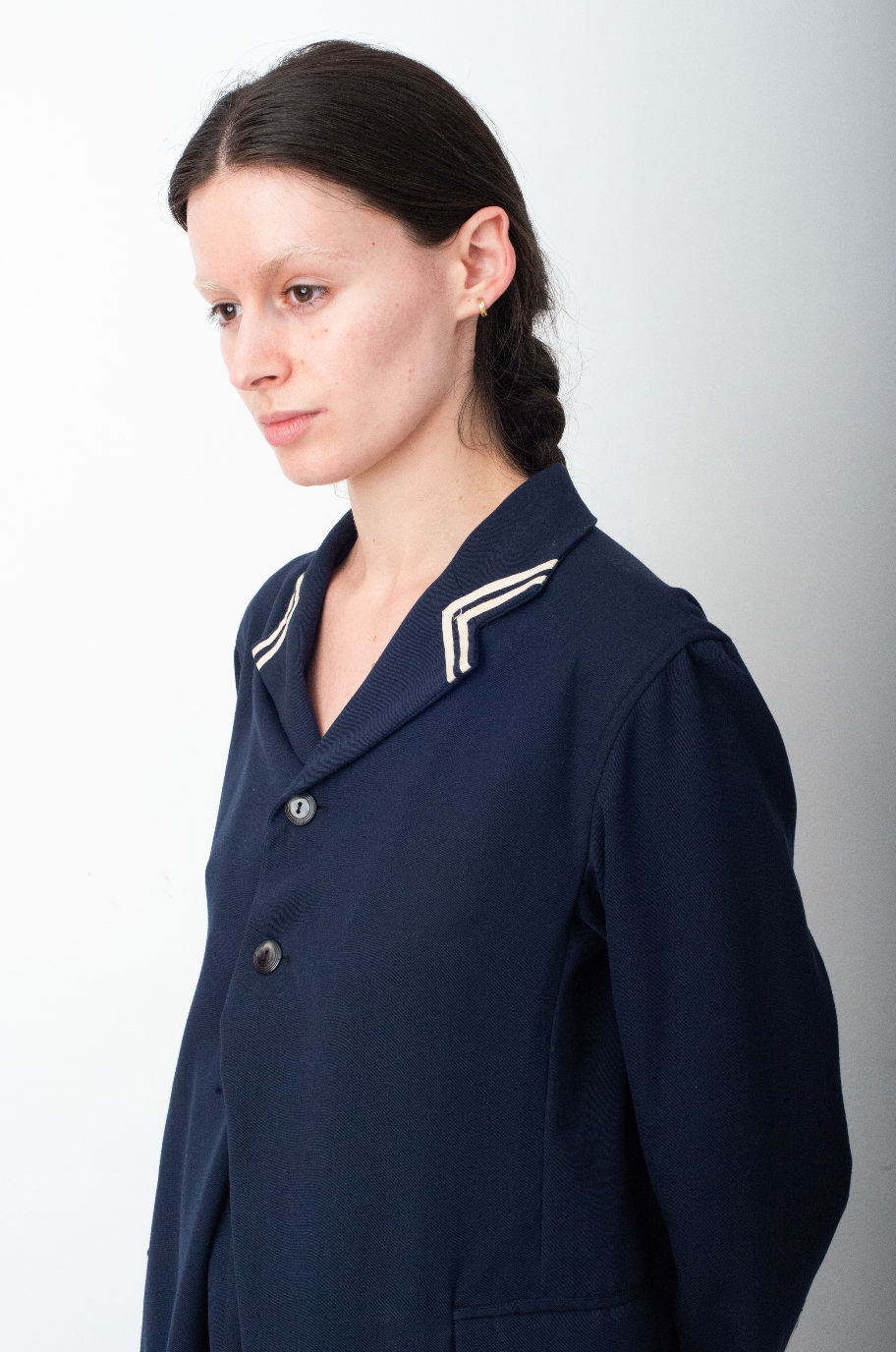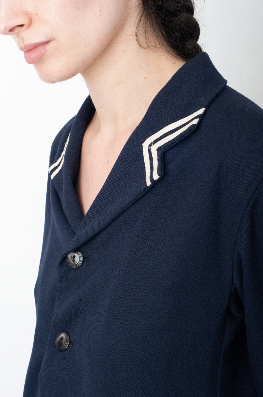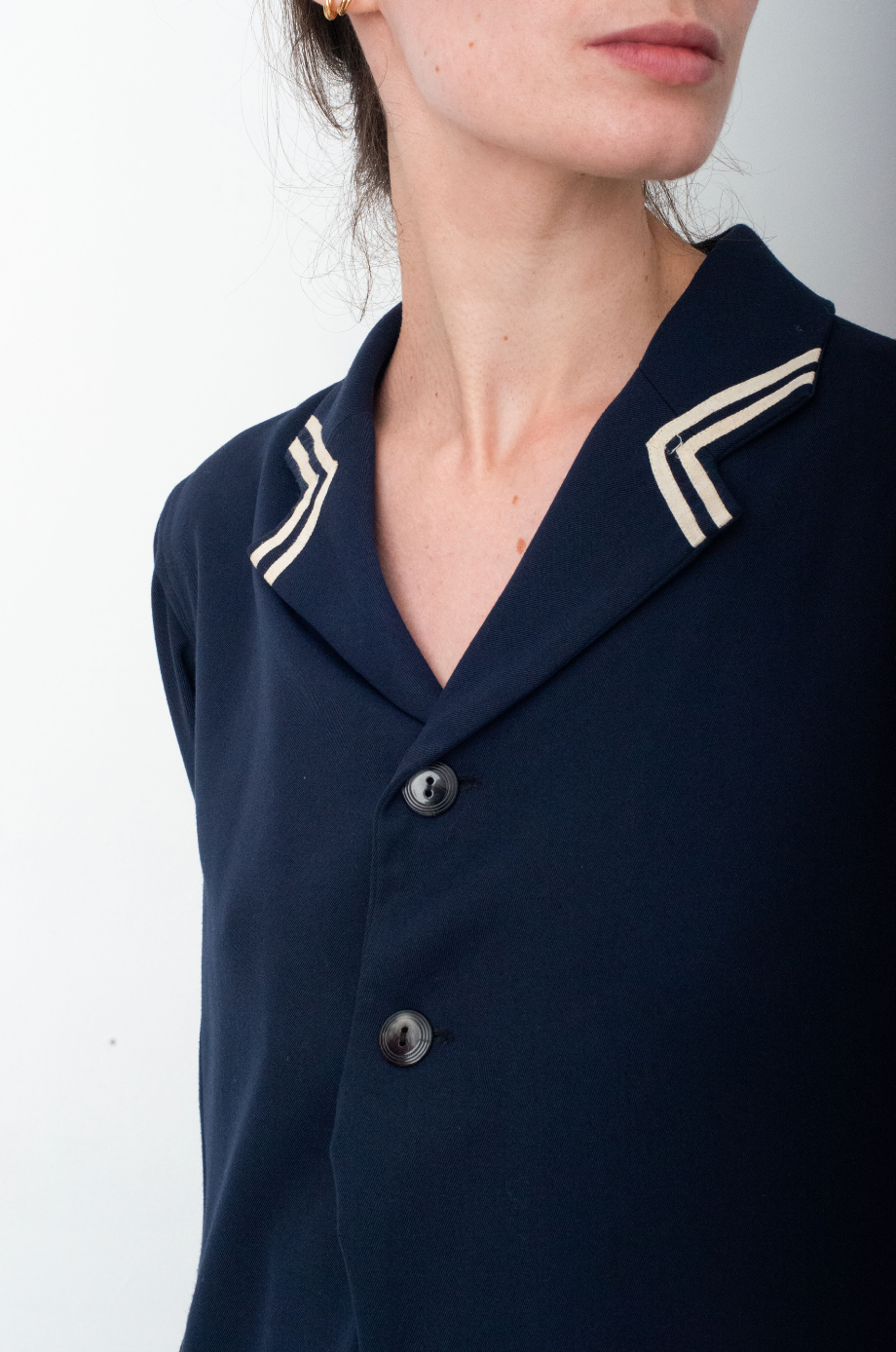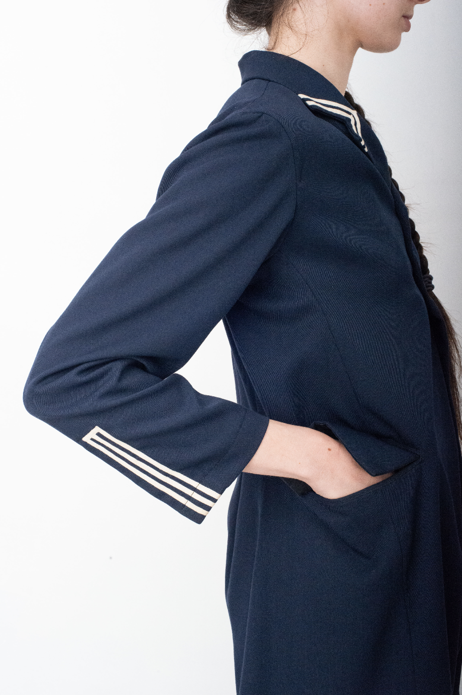The white lines on the collar and cuffs as well as the double line of buttons, remind us of the old navy uniforms that kids use to wear in the early 1900's.
