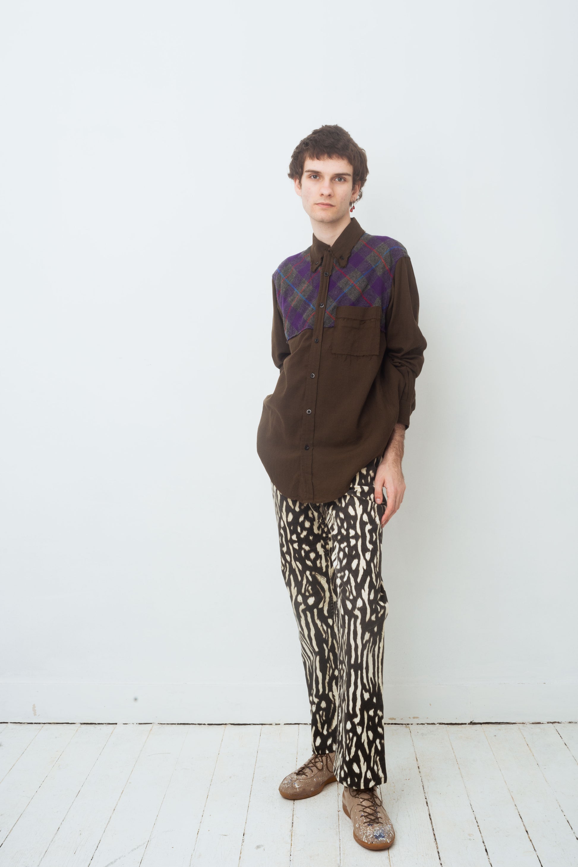 The shirt is made from a blend of cotton and wool, with a wool tartan patchwork detail on the upper body.